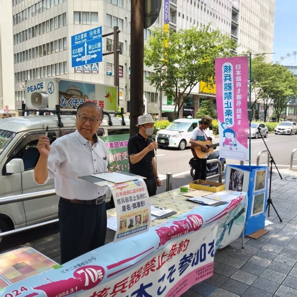 2017年7月7日、核兵器禁止条約が国連で122カ国の賛成で採択されました。2021年1月22日に発効した核兵器禁止条約は、今では署名国94カ国、73カ国が批准へと広がっています。そして昨年末には、核兵器禁止条約実現に大きな力を発揮した日本被団協がノーベル平和賞を受賞したのです。核兵器禁止条約採択から8年目を翌日に控えた7月6日、「日本政府に核兵器禁止条約参加を求める愛知県民の会」による宣伝・署名活動が、所属各団体から9名が参加して栄ラシック前で行われました。