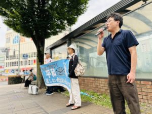 参加者が代わる代わるマイクを握り、ある参加者はギターを弾きながら歌って、核兵器の存在そのものを「悪」とした核兵器禁止条約の示す方向こそが世界の本流になっていると強調します。時あたかも参議院選挙の真っ最中、参加者は、核兵器禁止条約に背を向け締約国会議にオブザーバー参加さえしようとしない日本政府を批判して、自公政権を参議院でも過半数割れに追い込み、「核兵器禁止条約に参加する政府を」と訴えました。