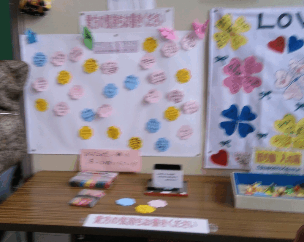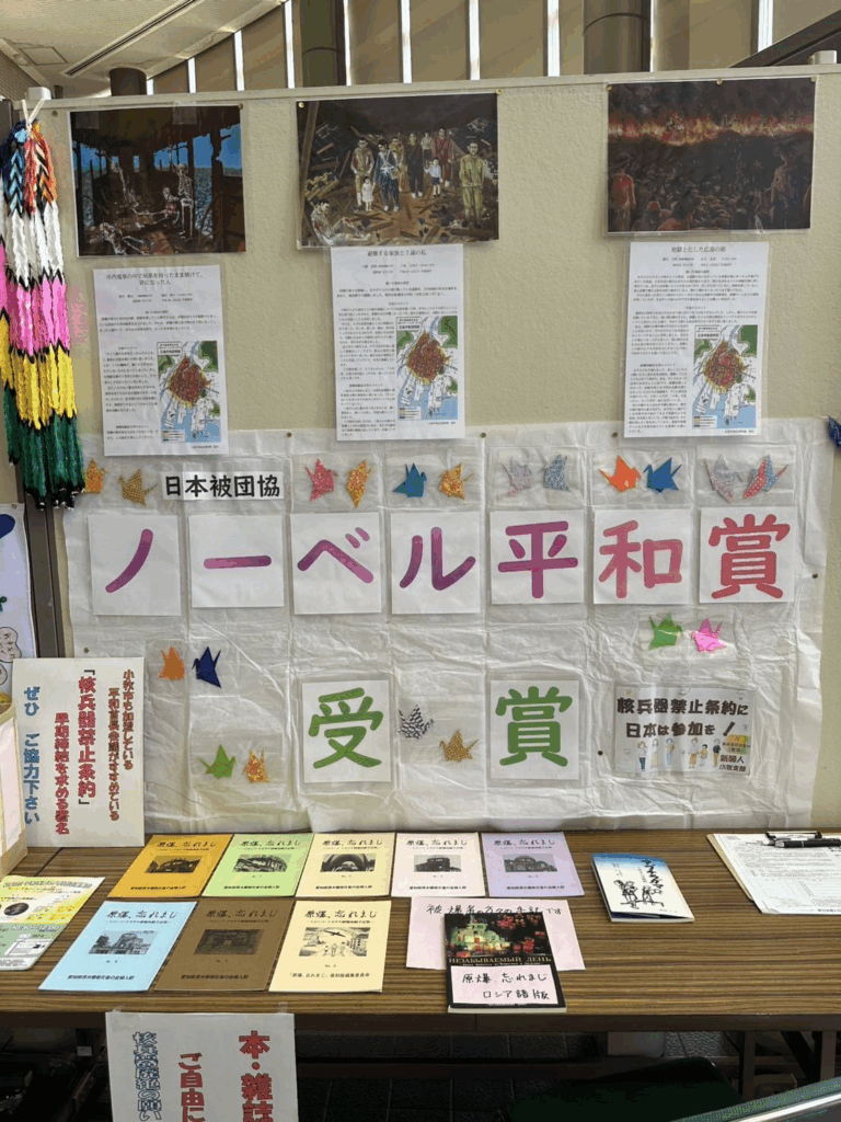 今年は、見に来た方に「平和・戦争・核兵器」に対する思いを付箋に書いてボードに張り付けてもらいました。「核兵器廃絶」「戦争のない世界を」など30名の方がそれぞれの思いを書いてくれました。(写真参照)