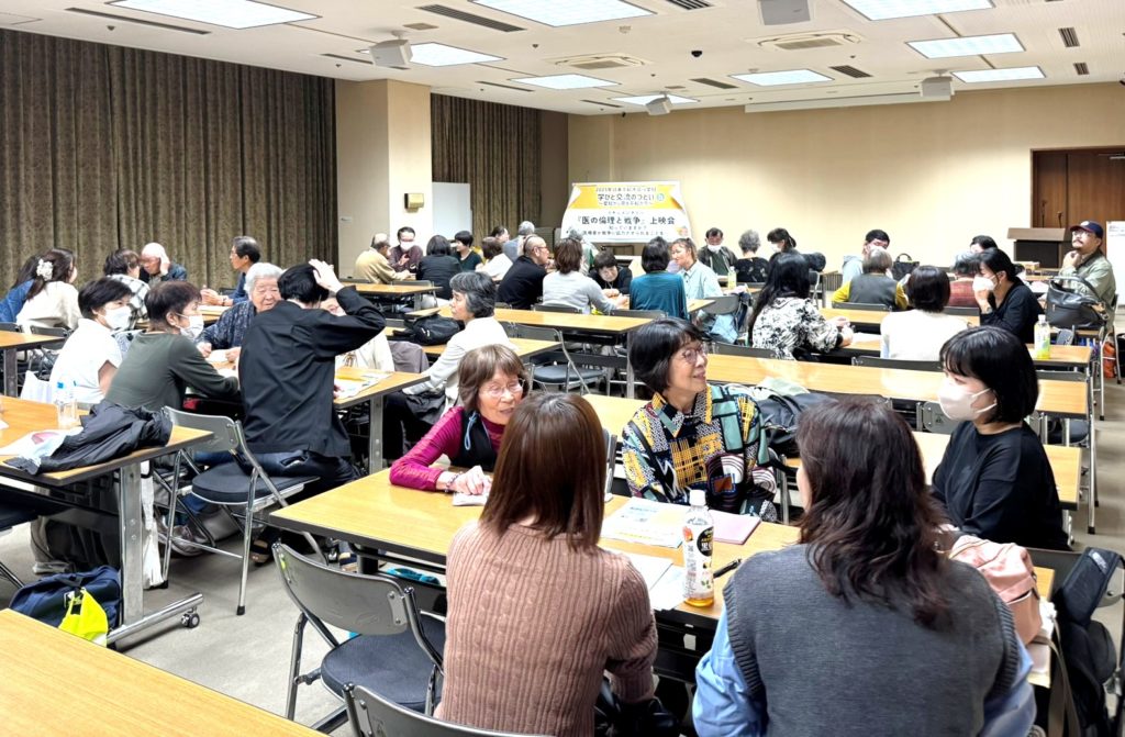 愛知県医労連、愛知民医連、愛知県保険医協会は共同でドキュメンタリー映画「医の倫理と戦争」上映会を実施しました。映画上映後は5~6人のグループで感想交流を行いました。まだ一般公開されていない映画のため大盛況で、90席が満席でした。戦争中、日本が中国人捕虜を「丸太」と称して人体実験を行っていた「731部隊」のことや、「慰安婦」について触れながら命と人権について深く考えさせられる映画です。歴史的にも医療者は戦争に真っ先に動員され、ナチスドイツに匹敵する日本の医療者による戦争犯罪の事実は、医療者にさえも明らかになっていません。映画でインタビューに応じた方の共通したメッセージは、「戦争に備えるのではなく、医療者は戦争を起こさないことに全力をあげるべき」というものです。