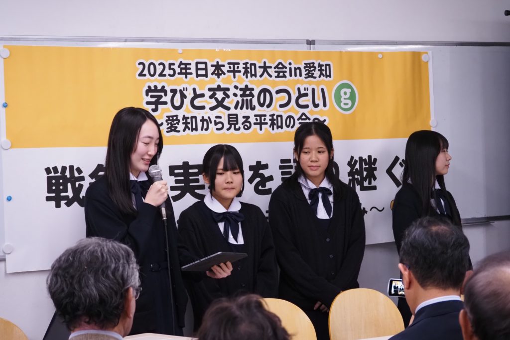 今回は、これまでピースステージに登壇した3校の高校と平ゼミに参加してもらいました。はじめに、椙山女学園高校から「『若い世代が平和を語り継ぐためにできることは何か』を探して」と題して、先生と高校生4人がそれぞれ話してくれました。