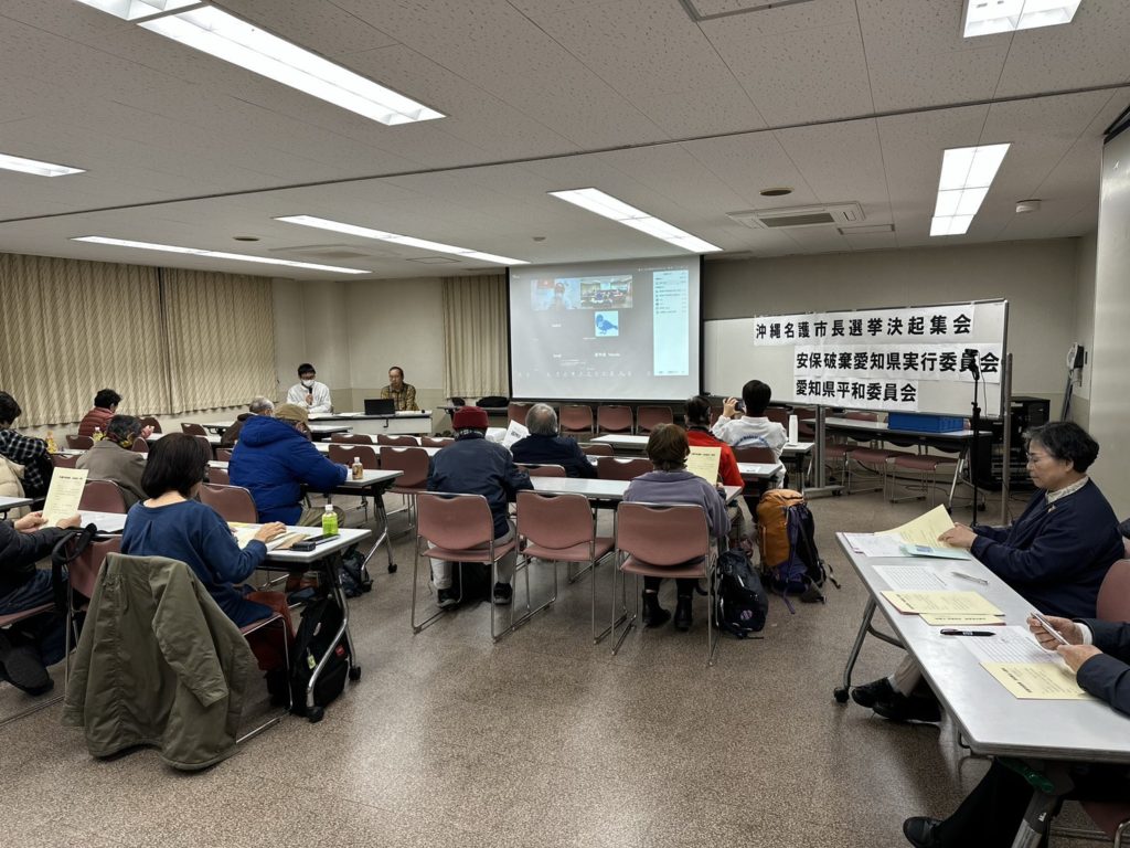 12月12日、名護市長選挙決起集会を安保破棄愛知県実行委員会とともに開催し、労働会館とオンラインで30人が辺野古新基地建設ストップ、市長選挙勝利への決意をともにしました。