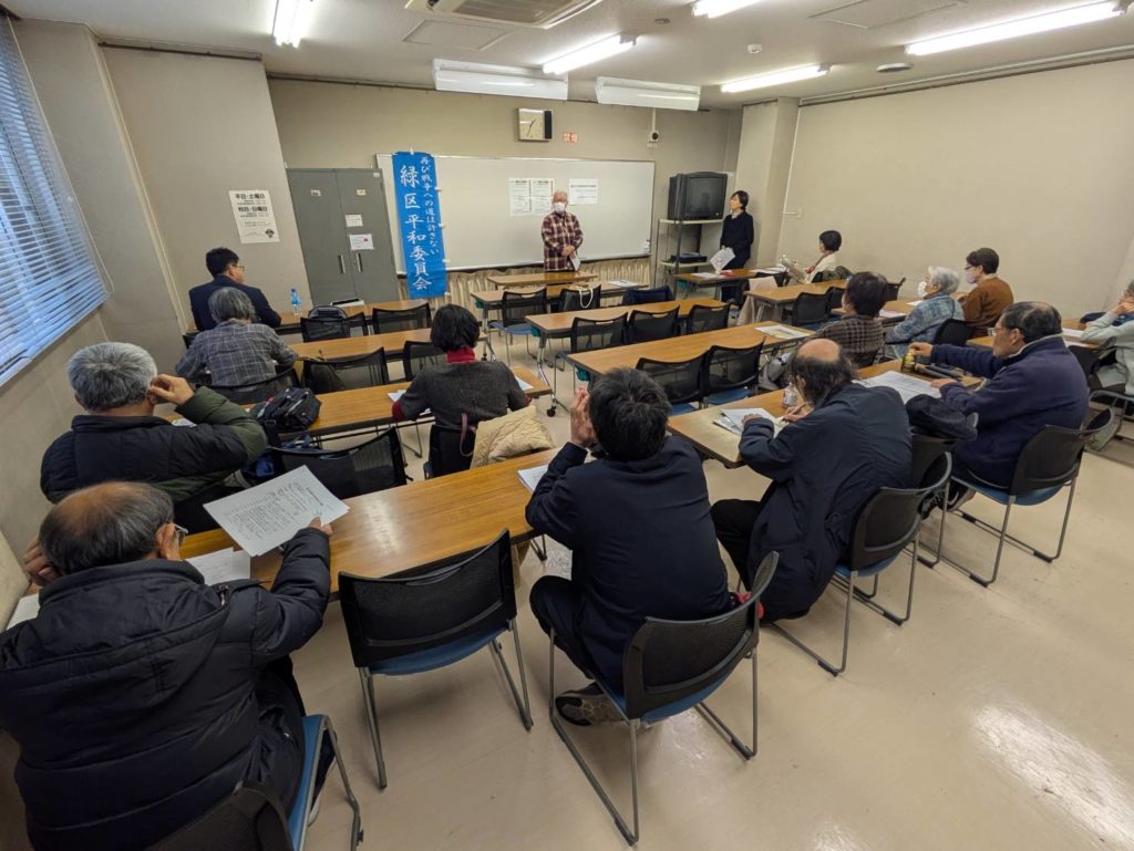 12月13日土曜日、第3回緑区平和委員会総会を開催しました。2021年から活動を始めて5年目。毎月世話人会議を開催。「日米地位協定の改定を求める署名」(緑区276筆)を2月市議会へ提出。3月27日「小牧・岐阜基地・日野射撃場ウォチング」は27名参加。6月14日「第12回緑区憲法を考えるつどい」には松元ヒロさんも参加。10月23日フィールドワークから始まった「2025日本平和大会in愛知」には、緑区からのべ35名の参加でした。また、緑区原水協に参加し、毎月の69署名宣伝行動・平和行進など取り組みました。この1年間で会員5名増、平和新聞読者は10名増でした。