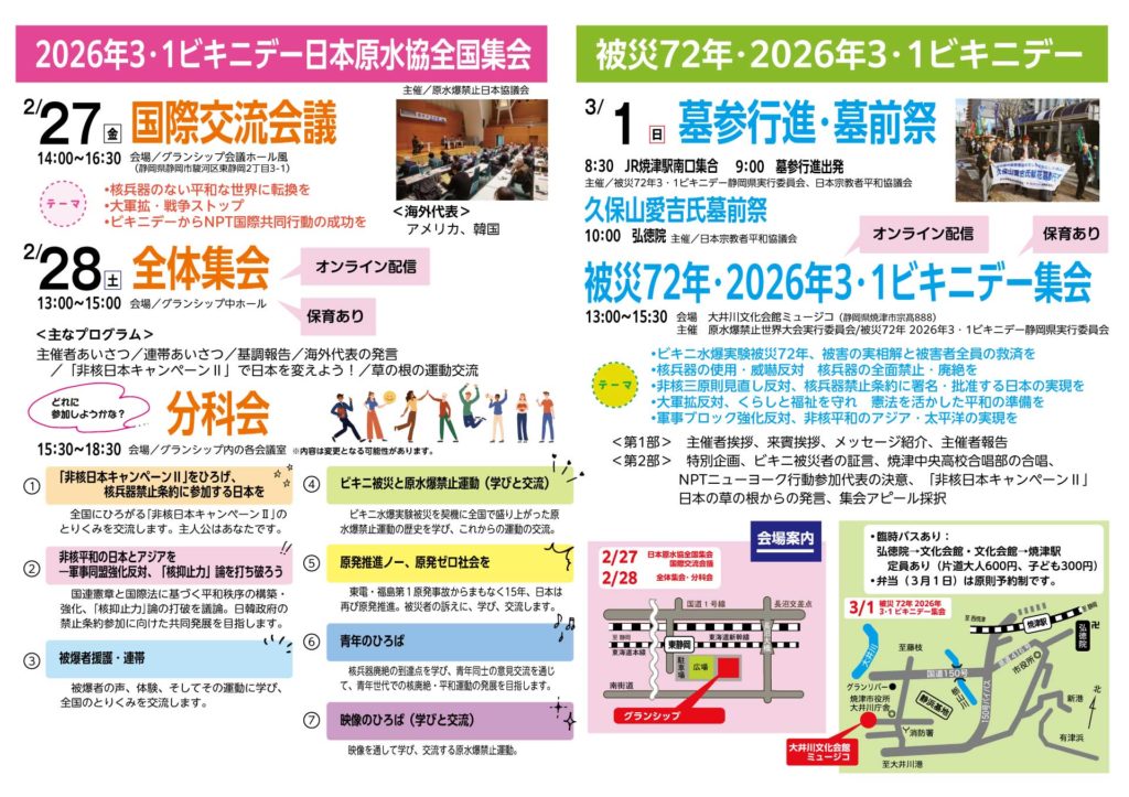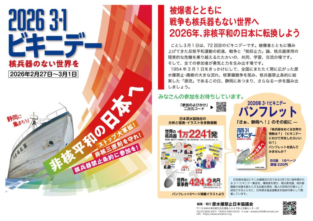 2026年3・1ビキニデーは、2月27日(金)が日本原水協・国際交流会議、28日(土)午前が東富士演習場行動、午後が3・1ビキニデー日本原水協全国集会の全体集会と分科会、3月1日(日)が、墓参行進、墓前祭と被災72年2026年3・1ビキニデー集会となります。