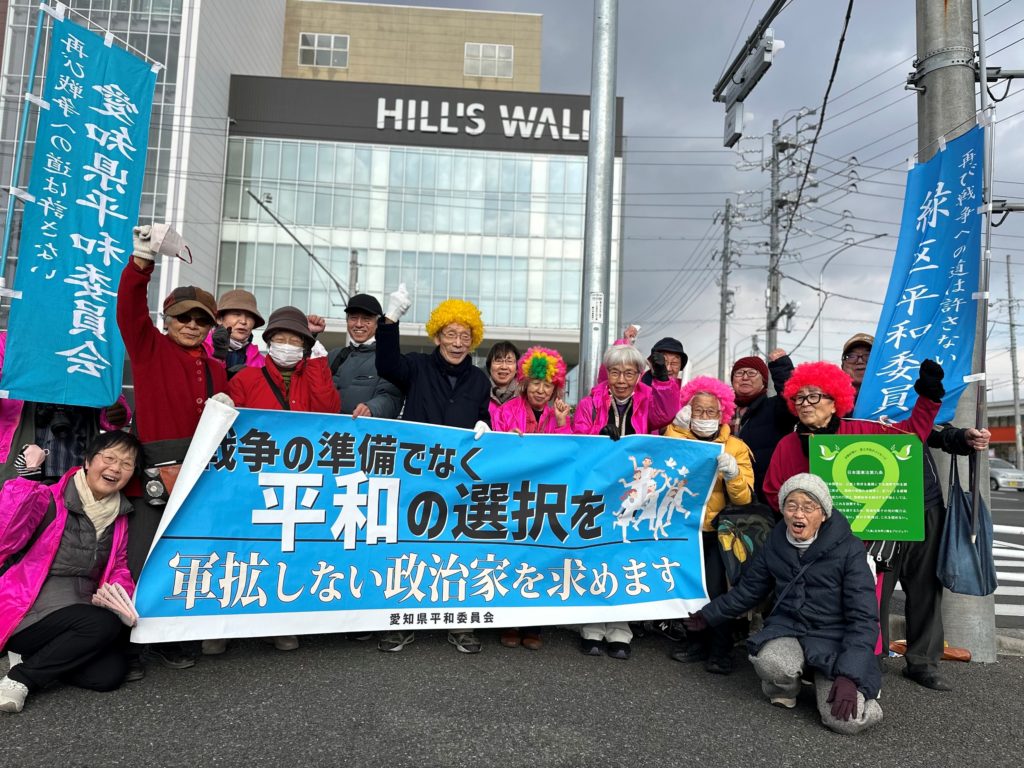2月6日、天白区では植田駅と平針駅の2か所で12名が参加。天白の平和委員会メンバーに加え、元保険医協会の方、平和行進実行委員会代表として弁護士が、九条の会の責任者の方も「選挙のためなら」と参加し、力強いスピーチをしてもらいました。緑区では、徳重駅に女性を中心として、実に20名を超える参加がありました。横断幕やバナー、色とりどりの仮装グッズが目を引きます。自らの言葉で語る平和の訴えは通行人の関心を呼ぶものとなりました。選挙結果は、残念なものとなりましたが、何より改憲策動はじめ戦争する国づくりをストップさせるため、平和委員会の役割はますます重要となっています。