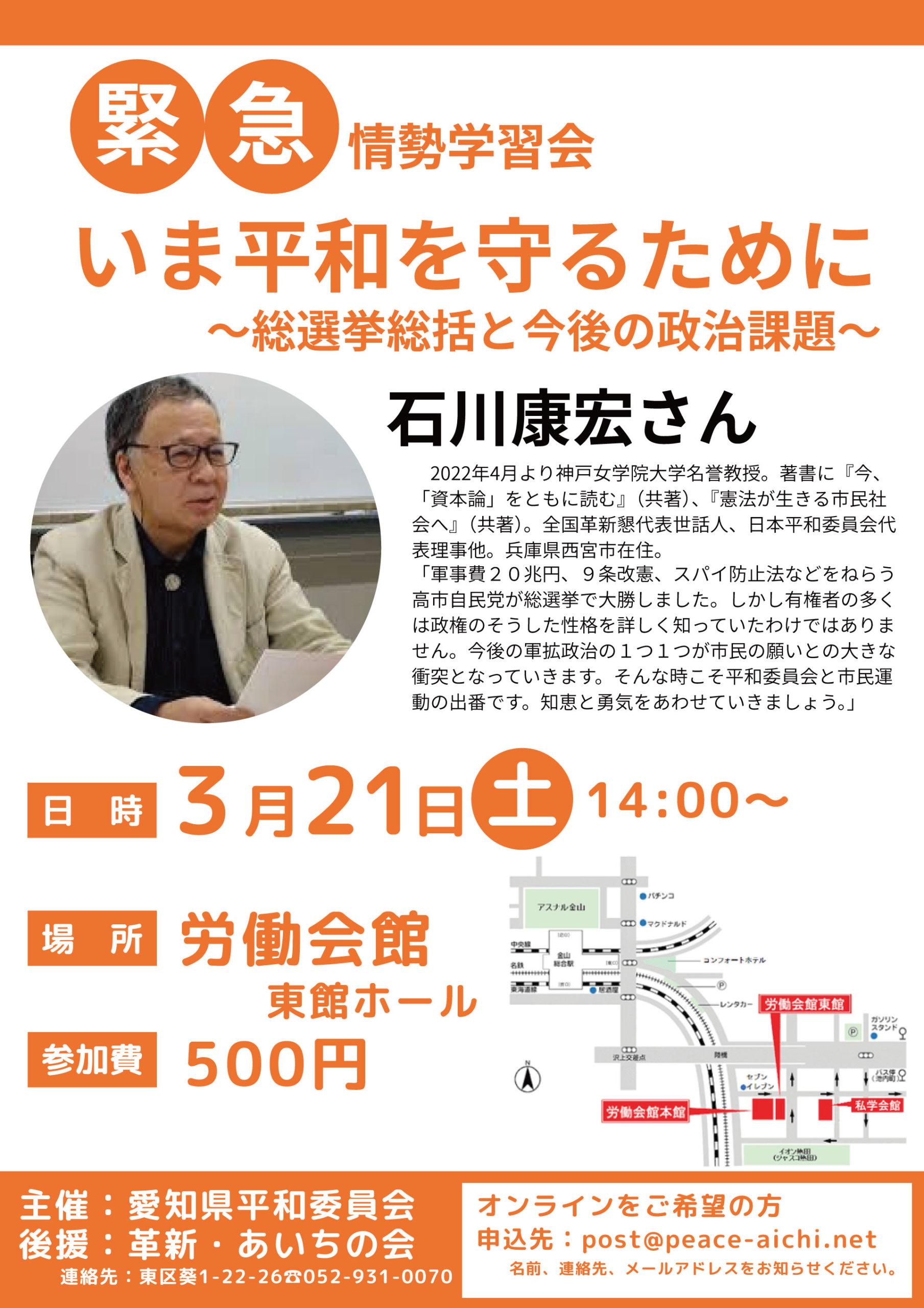 石川康宏さん学習会「いま平和を守るために」 FacebookXBlueskyHatenaCopy + Add to Google Calendar + iCal / Outlook export 00 days 00 hours 00 minutes 00 seconds Date 3月 21 2026 Time 2:00 PM Location 労働会館東館 2Fホール 愛知県名古屋市熱田区沢下町9-7 Share this event